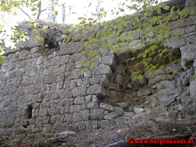 Dies zeigt ebenfalls die Westseite der Ruine. Das Mauerwerk ist sorgfältig gearbeitet, wie hier gut zu erkenen ist. Der längliche Schlitz links unten im Bild könnte eine Seh- bzw Schußscharte gewesen sein.